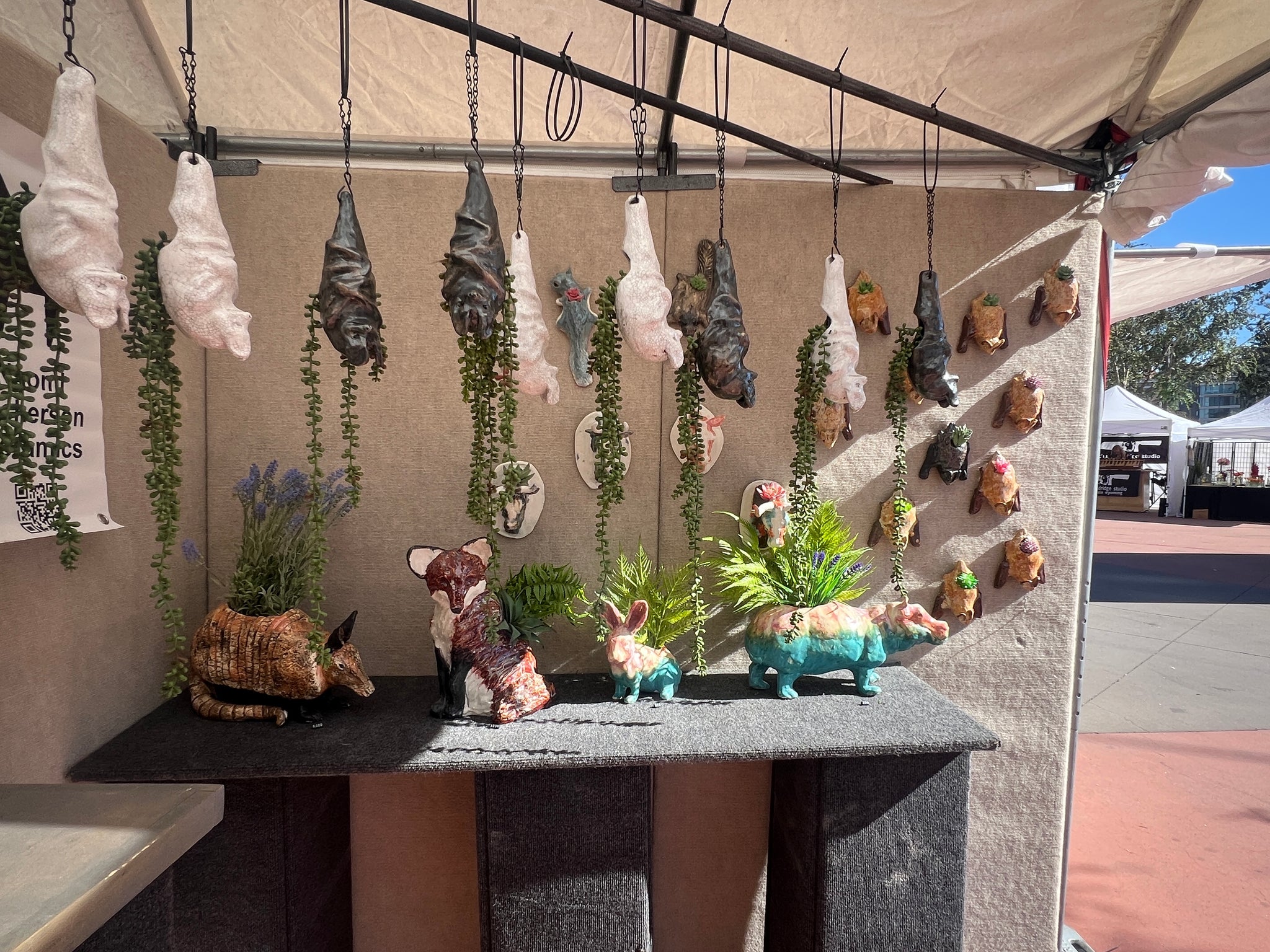 It's a hanging planter! This lovely swaddled bat is 6" in diameter and 10" in length. Sporting a drain hole and available in white crackle or sparkly black this novel hanger is sure to please.
